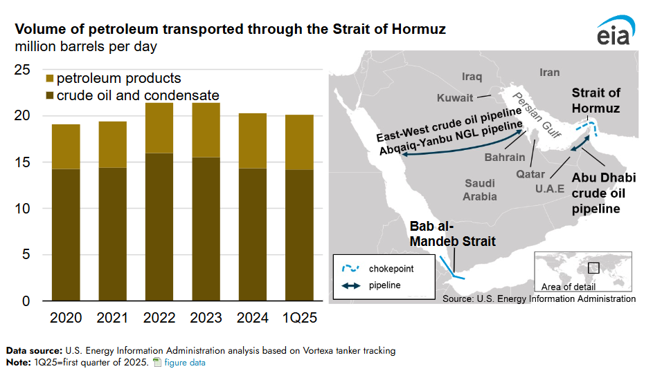 In 2025, oil flow through the strait was around 20 million barrels a day, which is estimated to be about 20% of global petroleum liquid consumption.